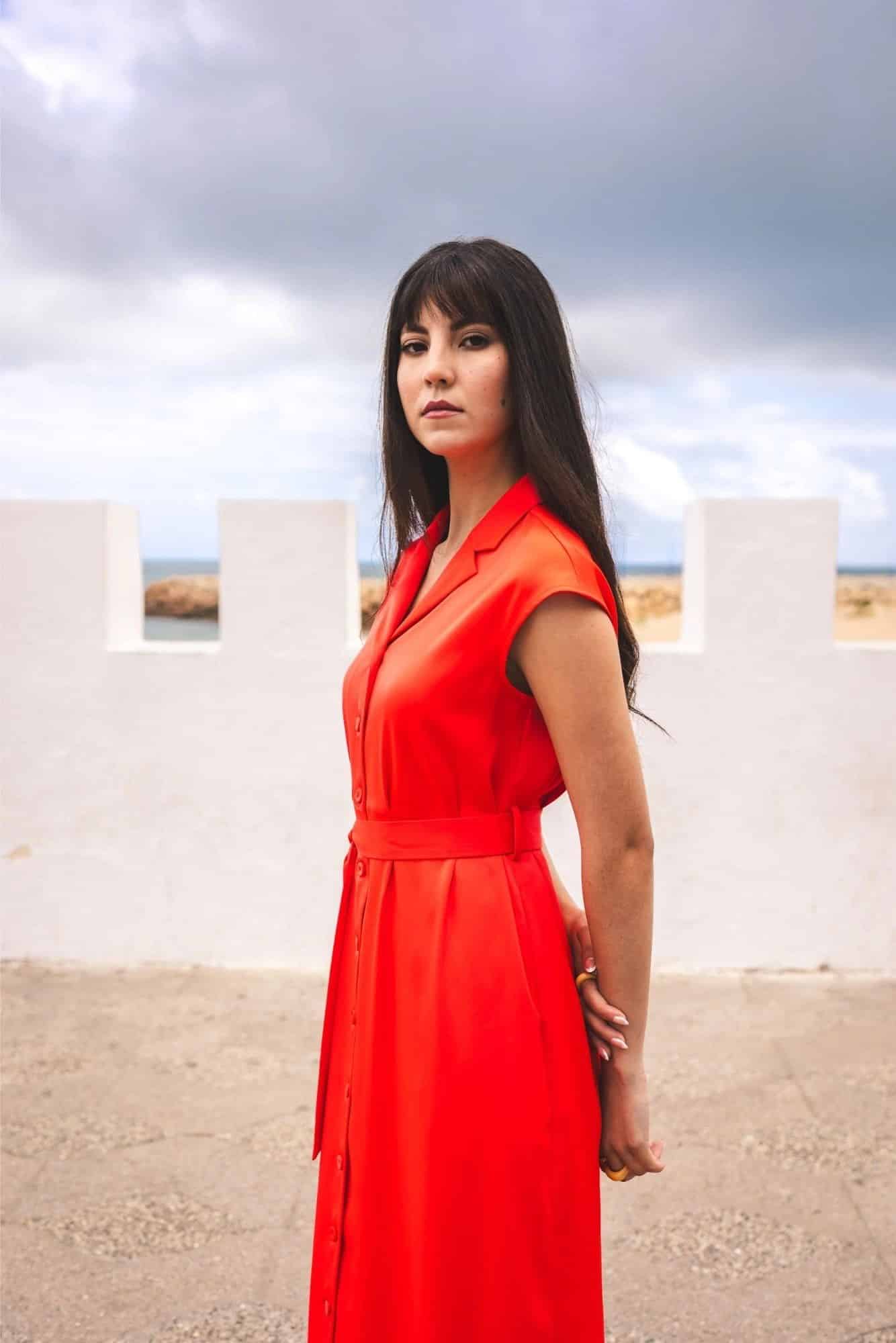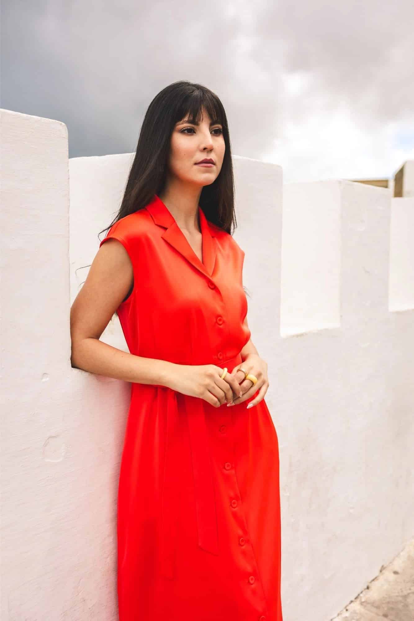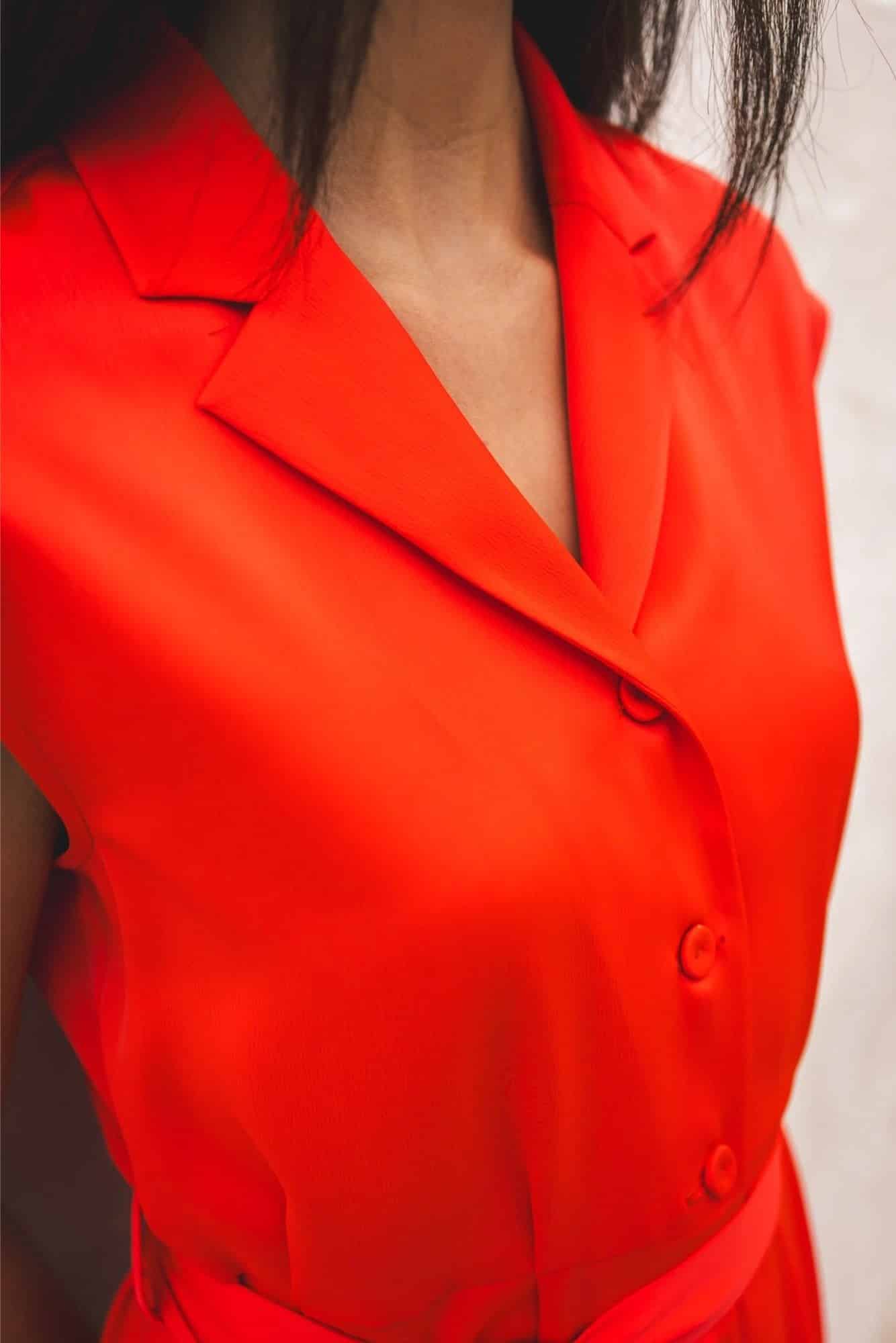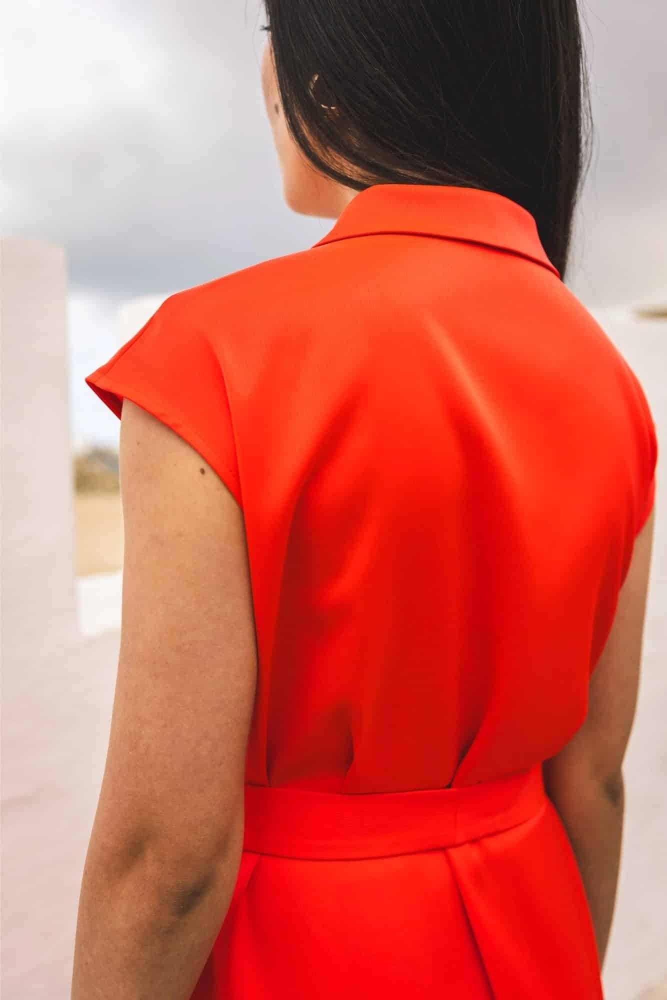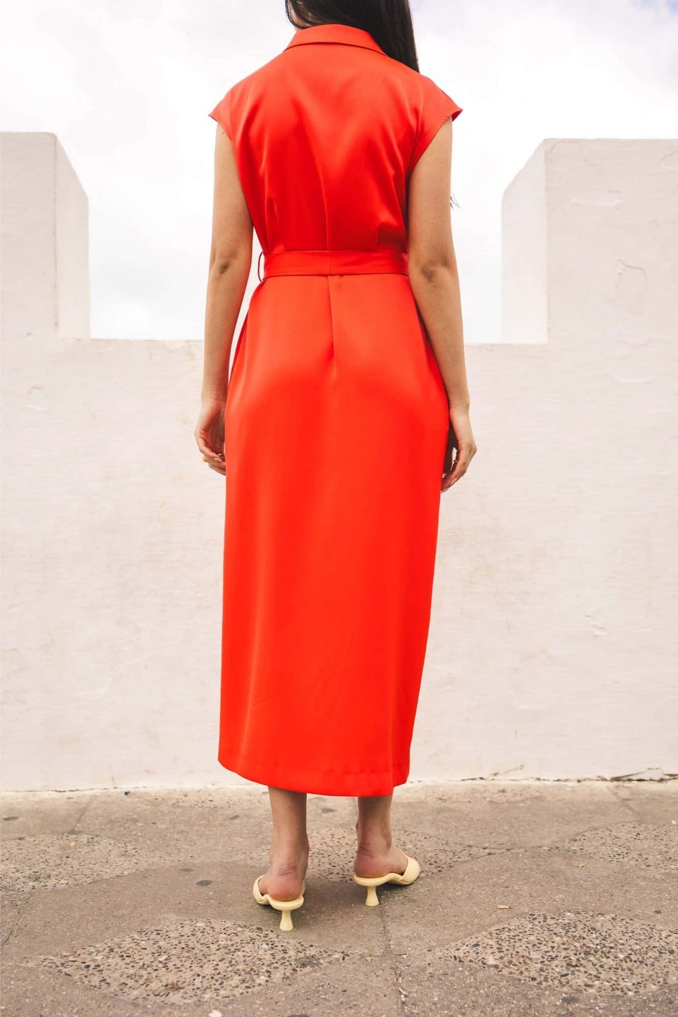 Made in a vibrant summer orange shade, it features soft sleeves that sit gracefully at the shoulder level, giving the dress a romantic and airy feel.